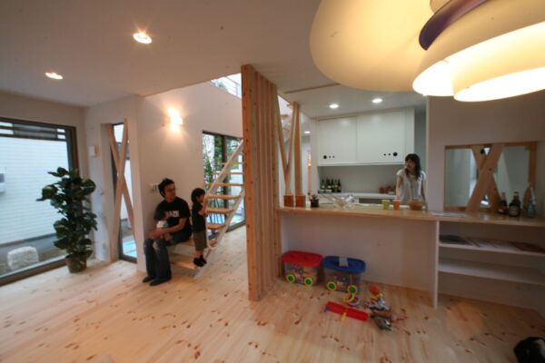 直行型シングルビーム 木製吹抜け手摺(アクリル入り)階段